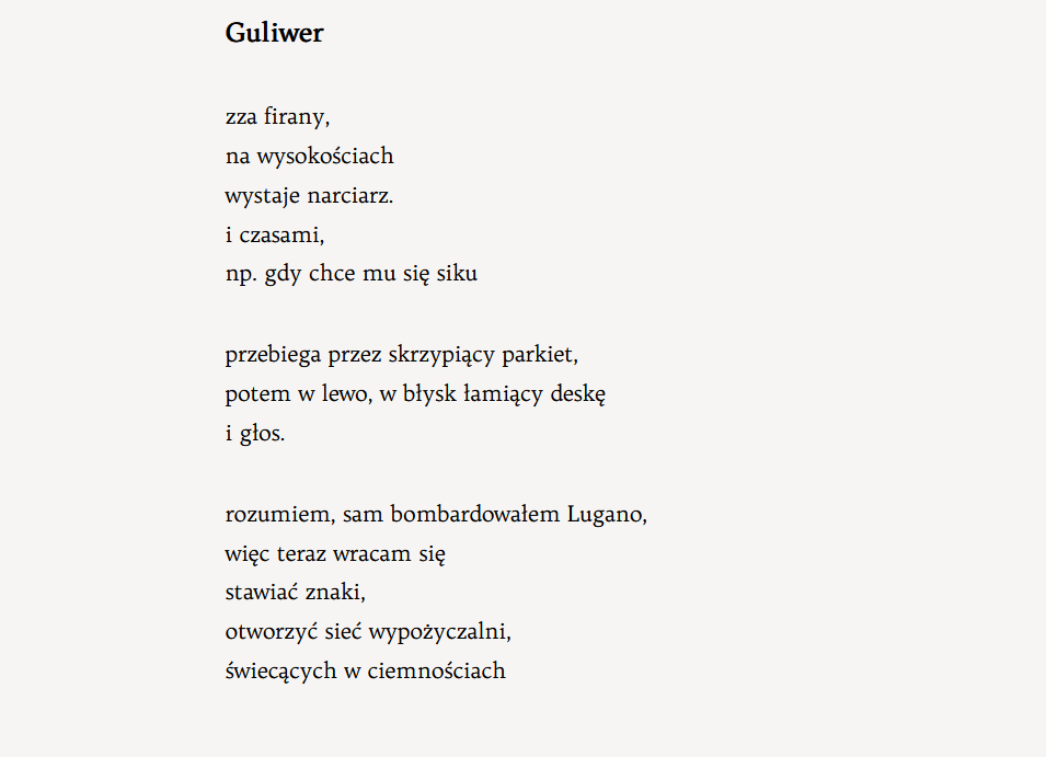 Mieszkańcy od dawna wiedzą o kształcie swej krainy, bo objechano już świat dookoła. Poprowadzono nawet tory wielkiej kolei, której skonstruowanie uznaje się za początek nowej epoki. Nie będę ci teraz opowiadać o wspaniałości granicznych miast, o rzeźbionej grobli pozlepianych ze sobą kamienic ich dzikich dachach, z których dzieciaki trzymane przez kolegów wychylają się co wieczór, byleby tylko móc sikać w przestrzeń. Nie opowiem, bo tak, bo najciekawsze nie jest wcale to, co zbudowano wokół góry, ale to, co pięło się nad życiami ludzi. Nigdy bowiem nikt – a uwierz, próbowało wielu – nie dotarł na jej wierzchołek. Ciężko nawet stwierdzić, czy planeta miała swój koniec, gdyż od pewnego momentu wydawała się być po prostu niezmienna. Wraz z napinającą się rzeźbą terenu, roślinność i zwierzyna karlała, przechodząc po cichu w pochyły blat stepu. I tylko woda spływając ukazywała się gdzieniegdzie w trawach cienkimi jak sznurówki strużkami, albo też grzmiała ze wcale nie szerszych rozpadlin. Ponoć właśnie od tych pęknięć w ziemi wzięło swój kształt to dziwaczne pismo, którym śmiertelni u brzegu łowią z swych głów błysk myśli.